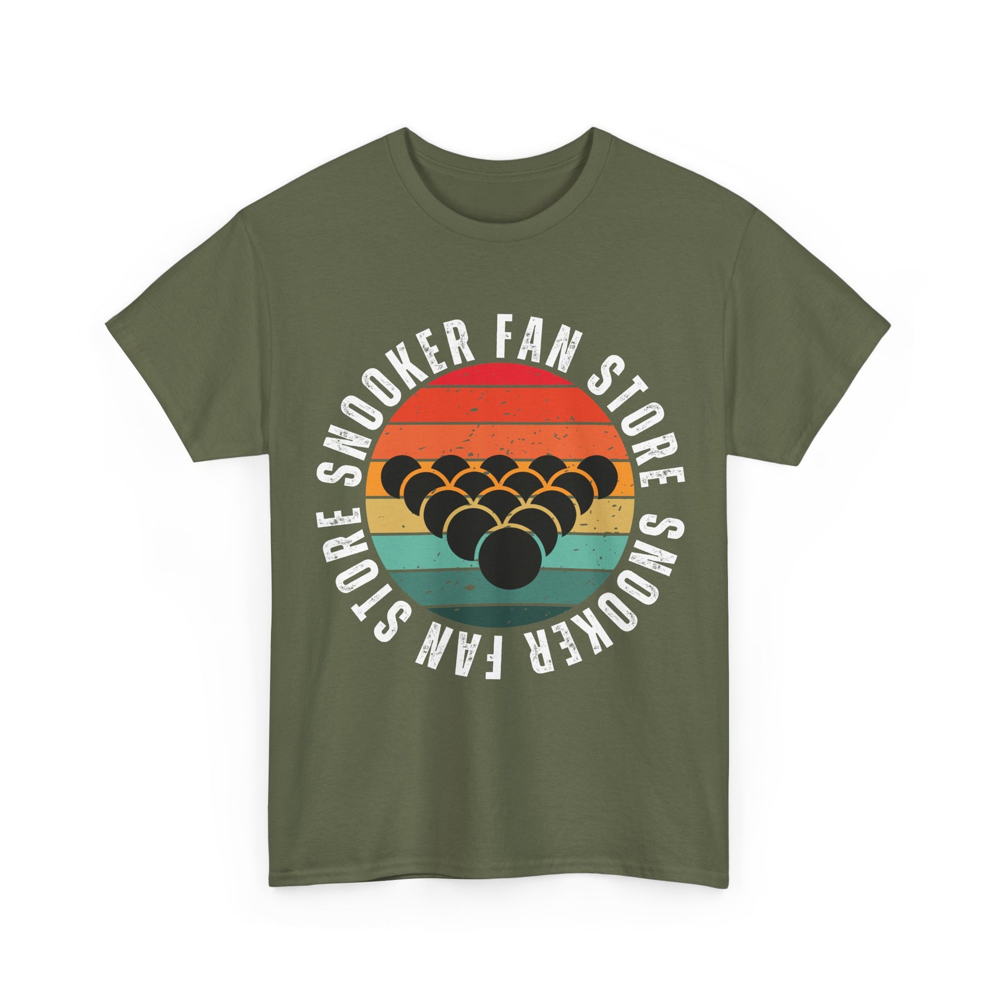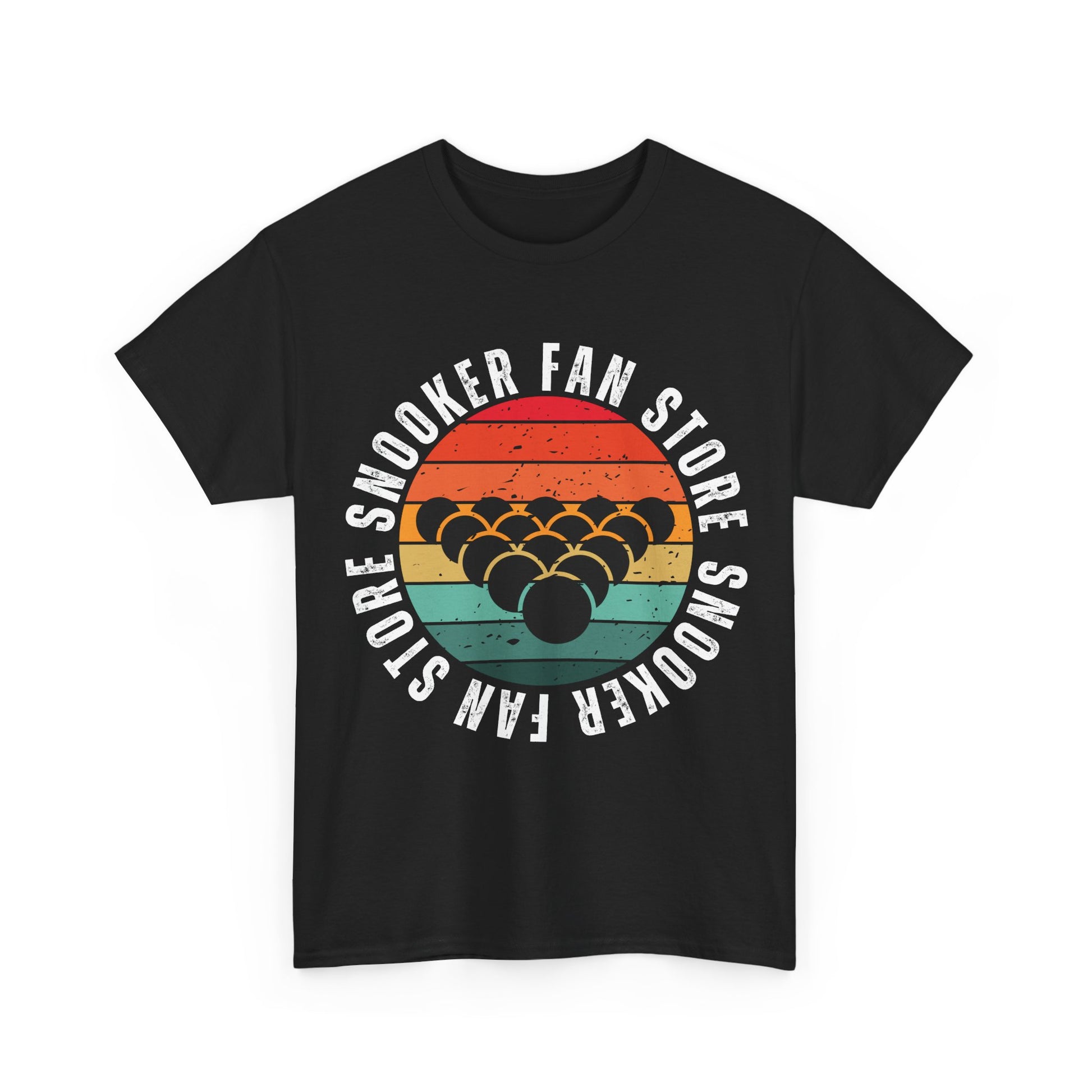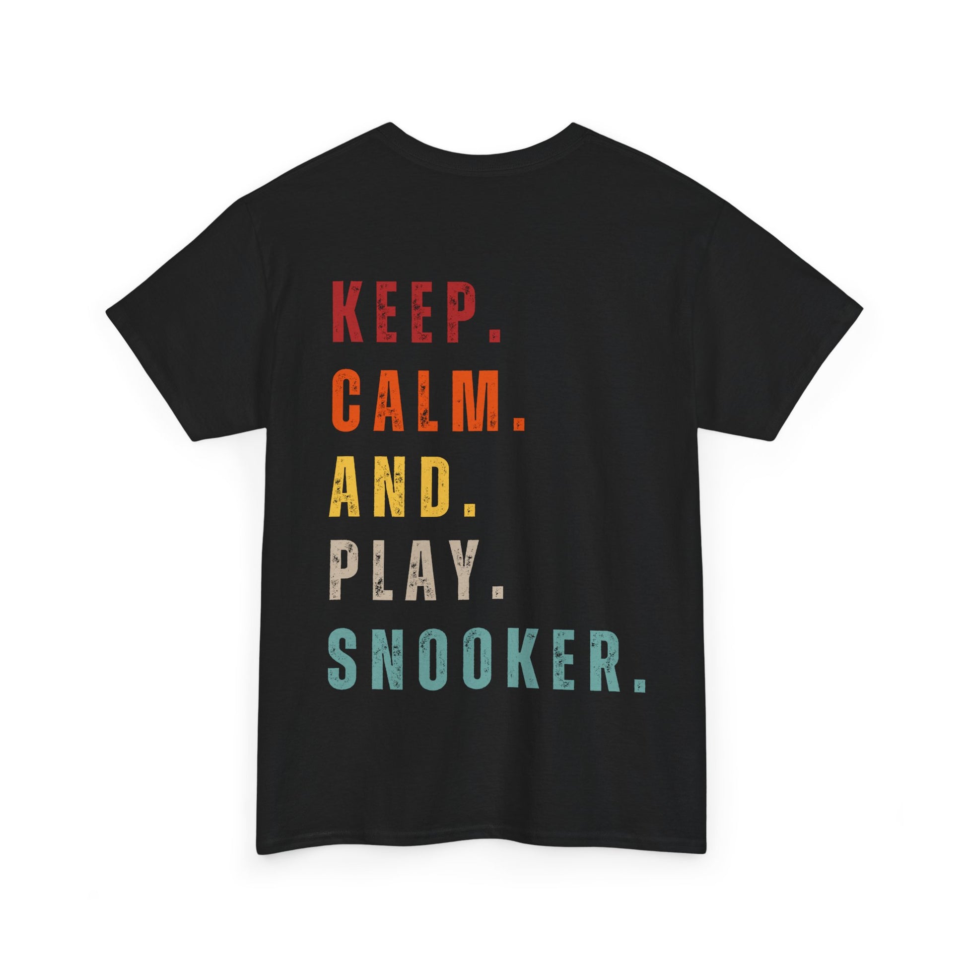 Snooker fan store logo t-shirt with 'keep calm and play snooker' text on the back. Sunset colors on both sides. This comfortable and stylish t-shirt is perfect for snooker enthusiasts looking to show off their passion for the game. It is a great addition to any casual outfit and can be worn during game nights or tournaments. Ideal for adults celebrating snooker-related occasions or events.