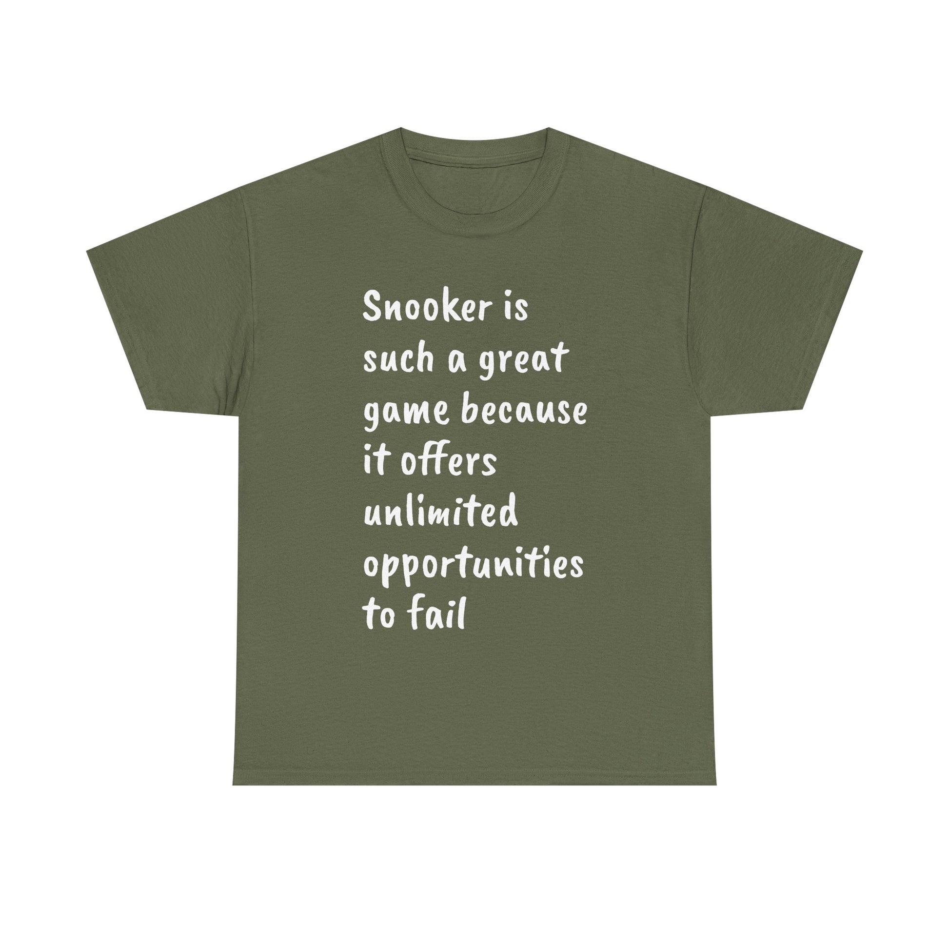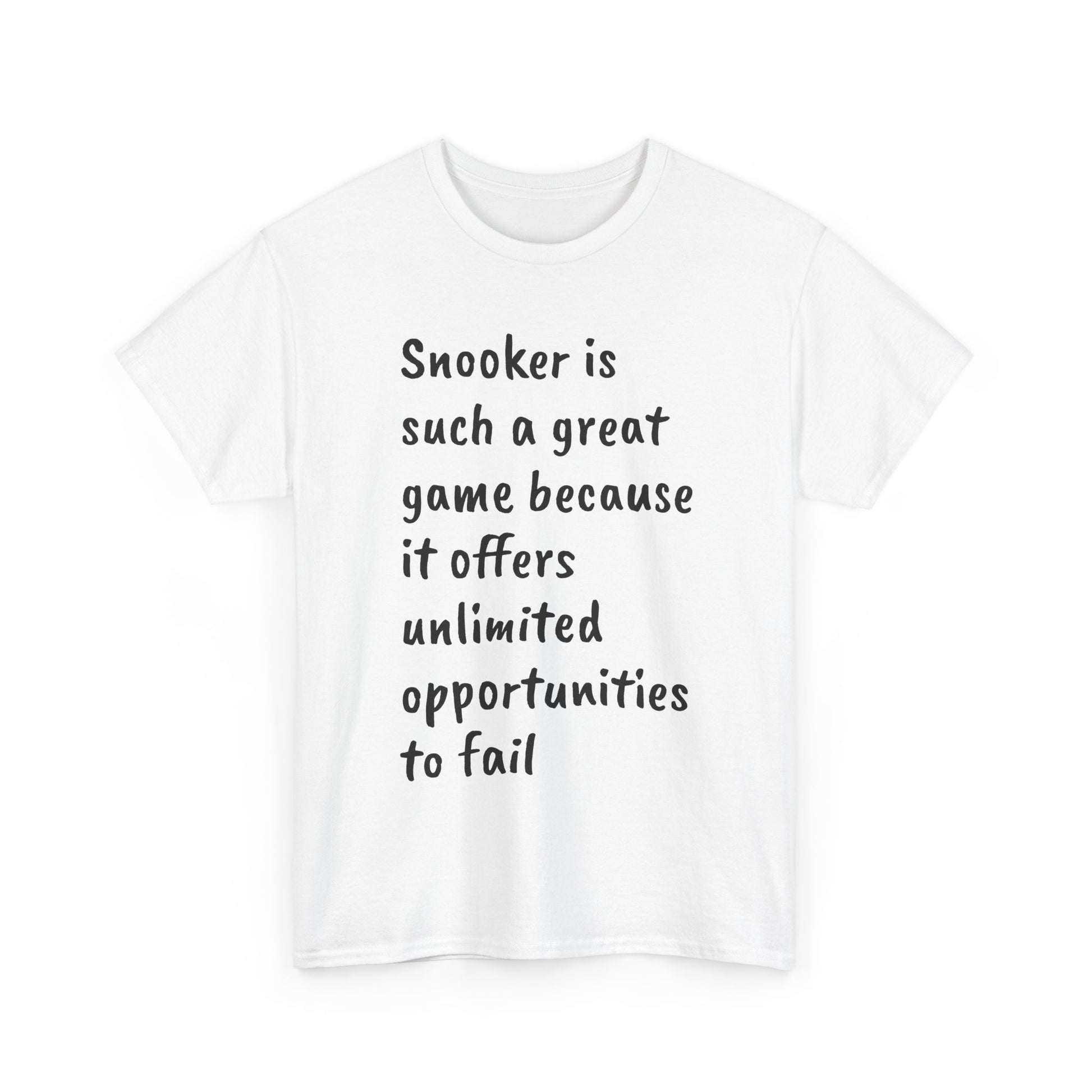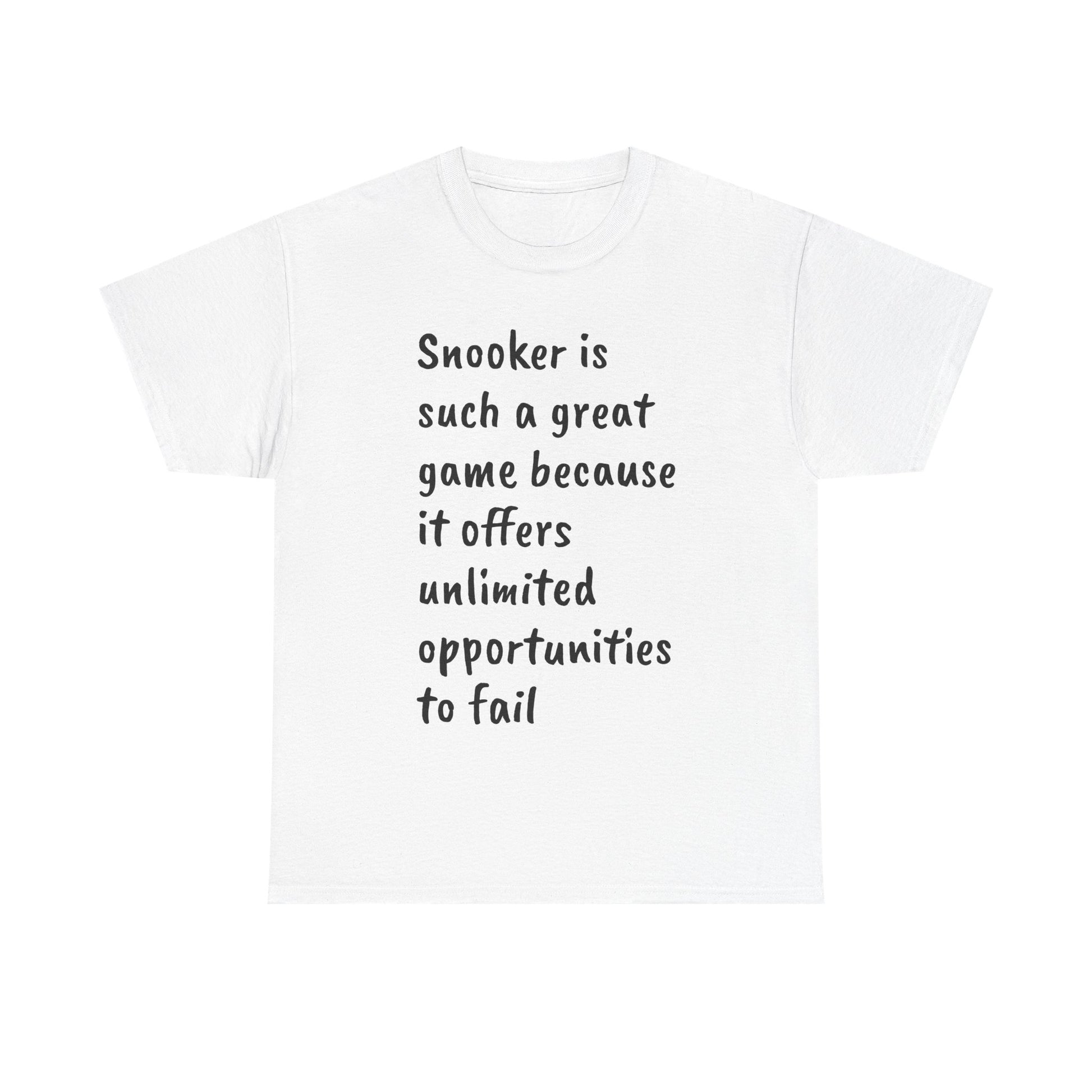 A classic unisex heavy cotton tee featuring a text that reads 'snooker is such a great game because it offers unlimited opportunities to fail, a real fan's shirt'. Perfect for snooker enthusiasts who enjoy a comfortable and durable tee to wear while playing or watching matches. Ideal for gifting on birthdays, holidays, or just to show appreciation for the game.
