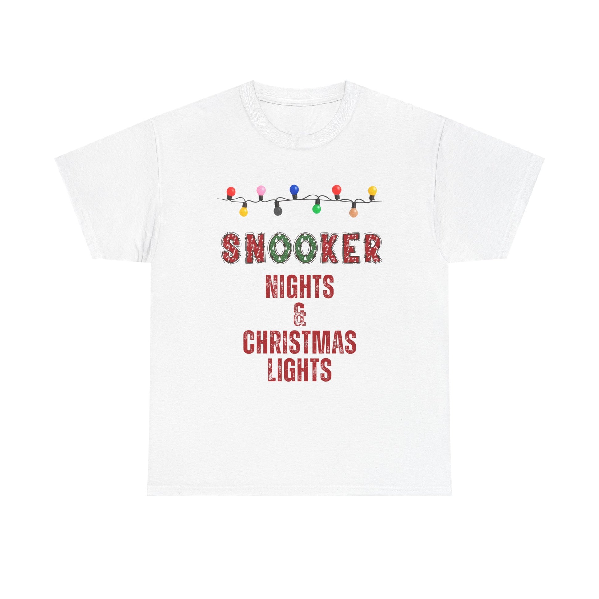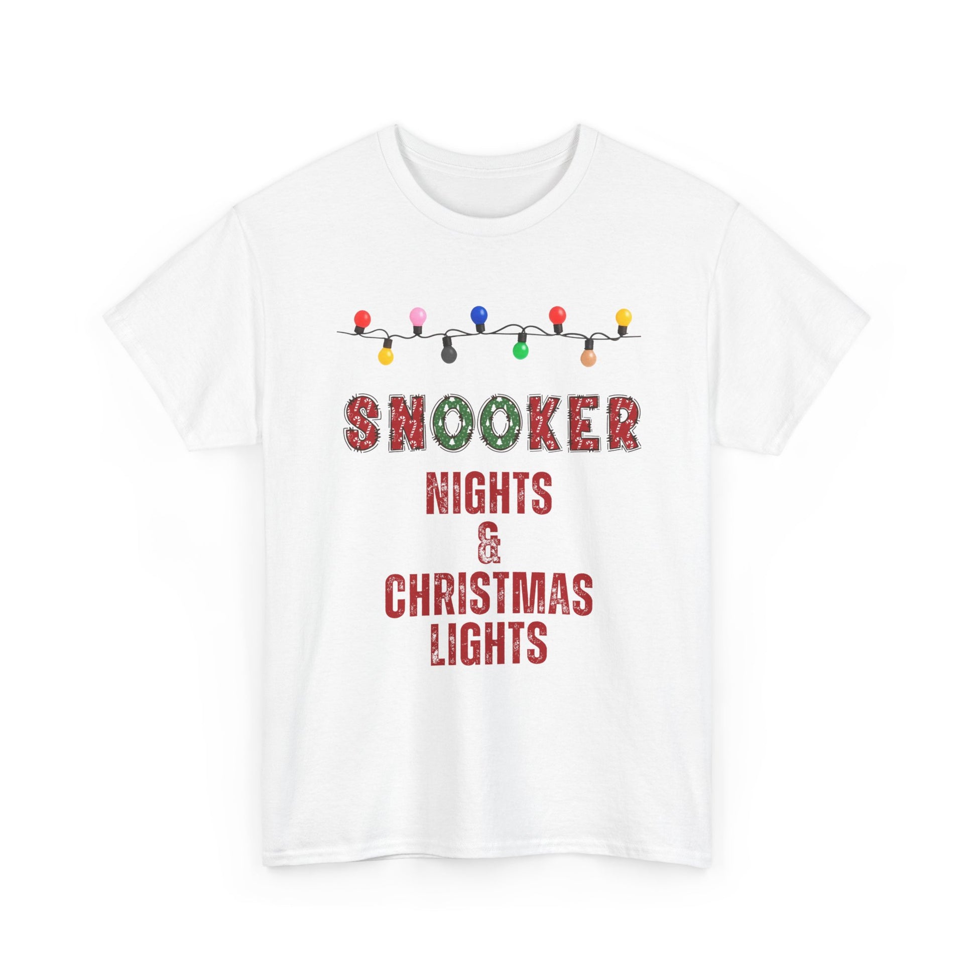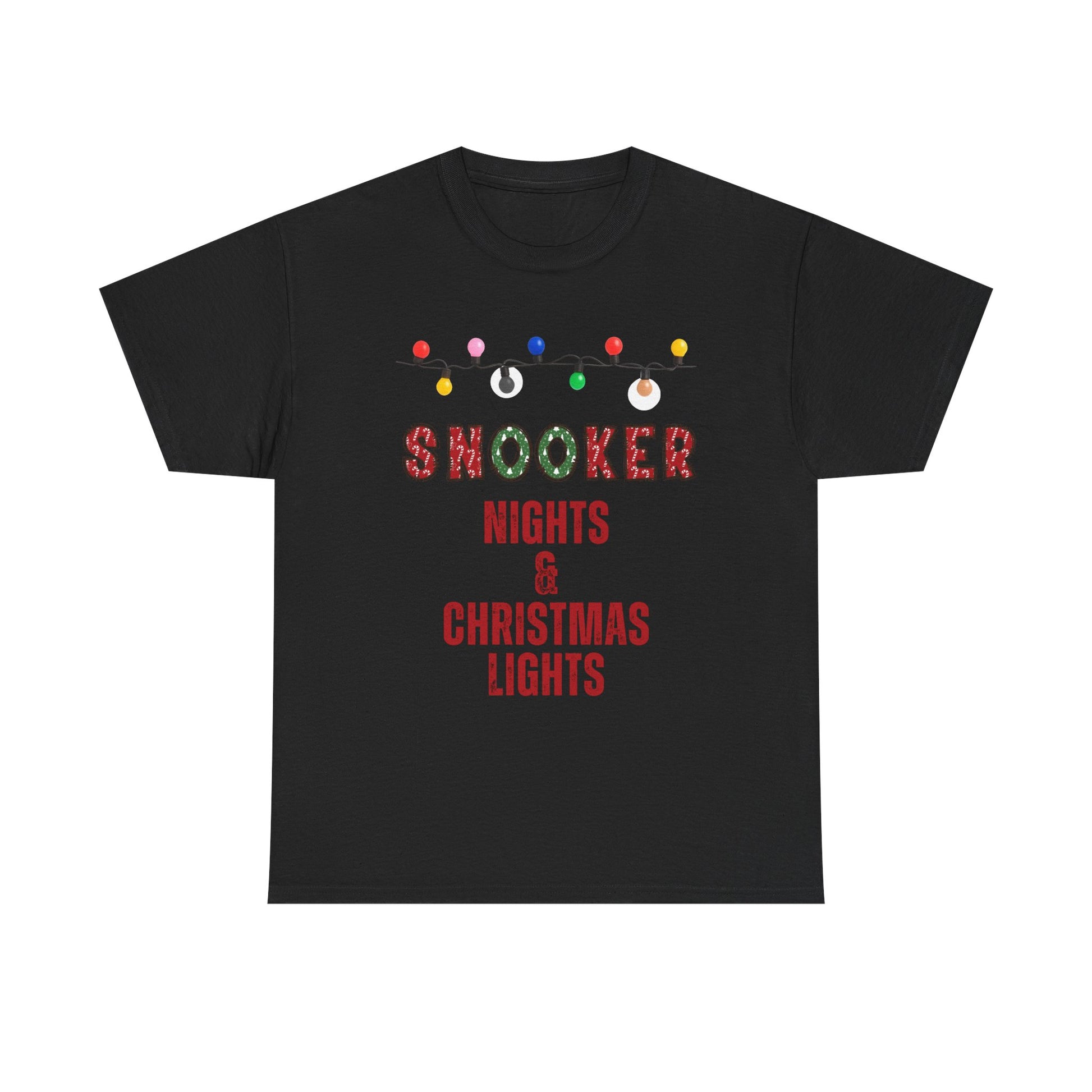 Cordial and cozy, this classic cotton tee celebrates nights at the snooker table wrapped in the warm glow of Christmas lights. The front shows a playful string of colorful bulbs above bold, festive lettering: “SNOOKER NIGHTS & CHRISTMAS LIGHTS.” Lightweight but sturdy, the shirt sits comfortably on the shoulders and keeps its shape game after game or around the holiday table. Wear it for late-night frames, small pub tournaments, or low-key family gatherings where laughter and friendly competition meet seasonal cheer.